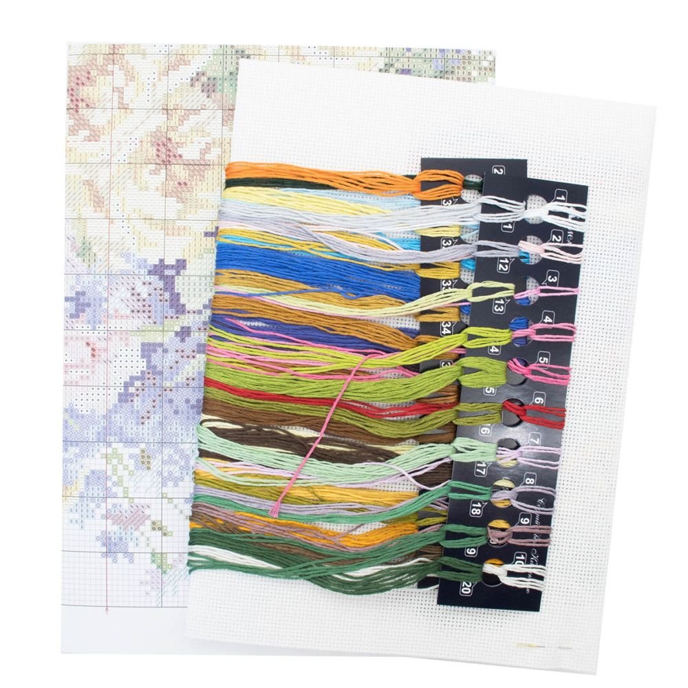 Kit contains: fabric Aida canvas 14ct. white, mouline threads (100% cotton) 40 colours, needle, chart. Finished size: 40x30cm/15.75x11.81". Frame is not included
