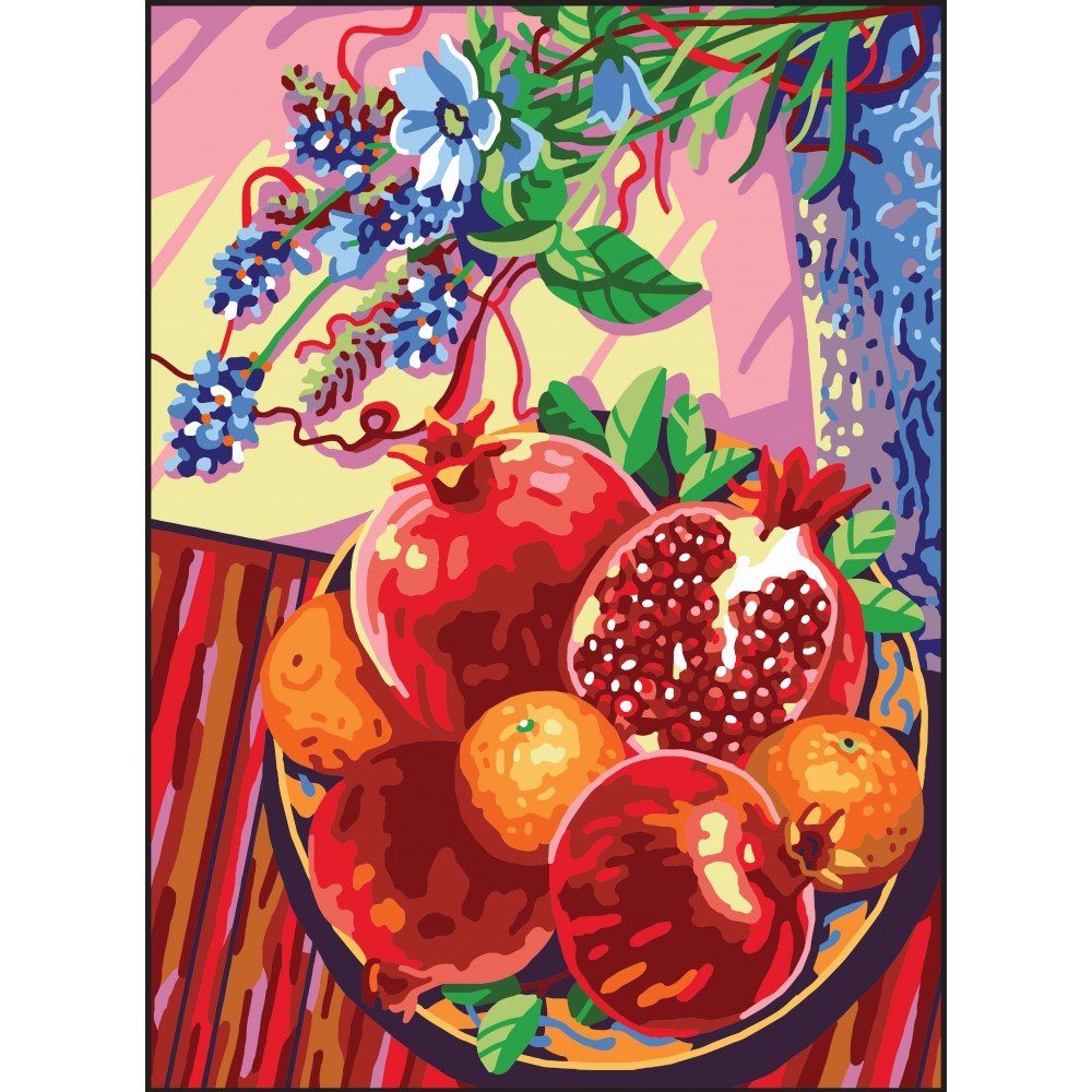 Cañamazo estampado "Pomegranates", pintado para facilitar el bordado/esterilla para bordar con diseño marcado, tela: Zweigart Stramin blanco (100% algodón), 44 puntos de cruz por 10 cm (11 count). Tamaño del diseño terminado: 22 x 30 cm/8.66 x 11.81", medida del cañamazo: 30 x 40 cm/11.81 x 15.75". ¡Hilos no incluidos! Bordado en punto de cruz, medio punto o punto de gobelino. Hilos adecuados: lana, acrílico grueso, mouliné de algodón (por ejemplo, DMC) - ideal para punto de cruz de 4 hebras o medio punto de 6 hebras. Números de colores impresos del catálogo DMC para seleccionar hilos o abalorios. La tela/esterilla, que se asemeja a una malla rígida y fina, permite un trabajo excelente sin aro ni gráfico.