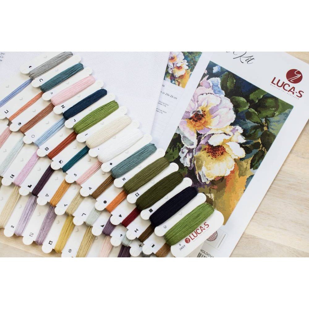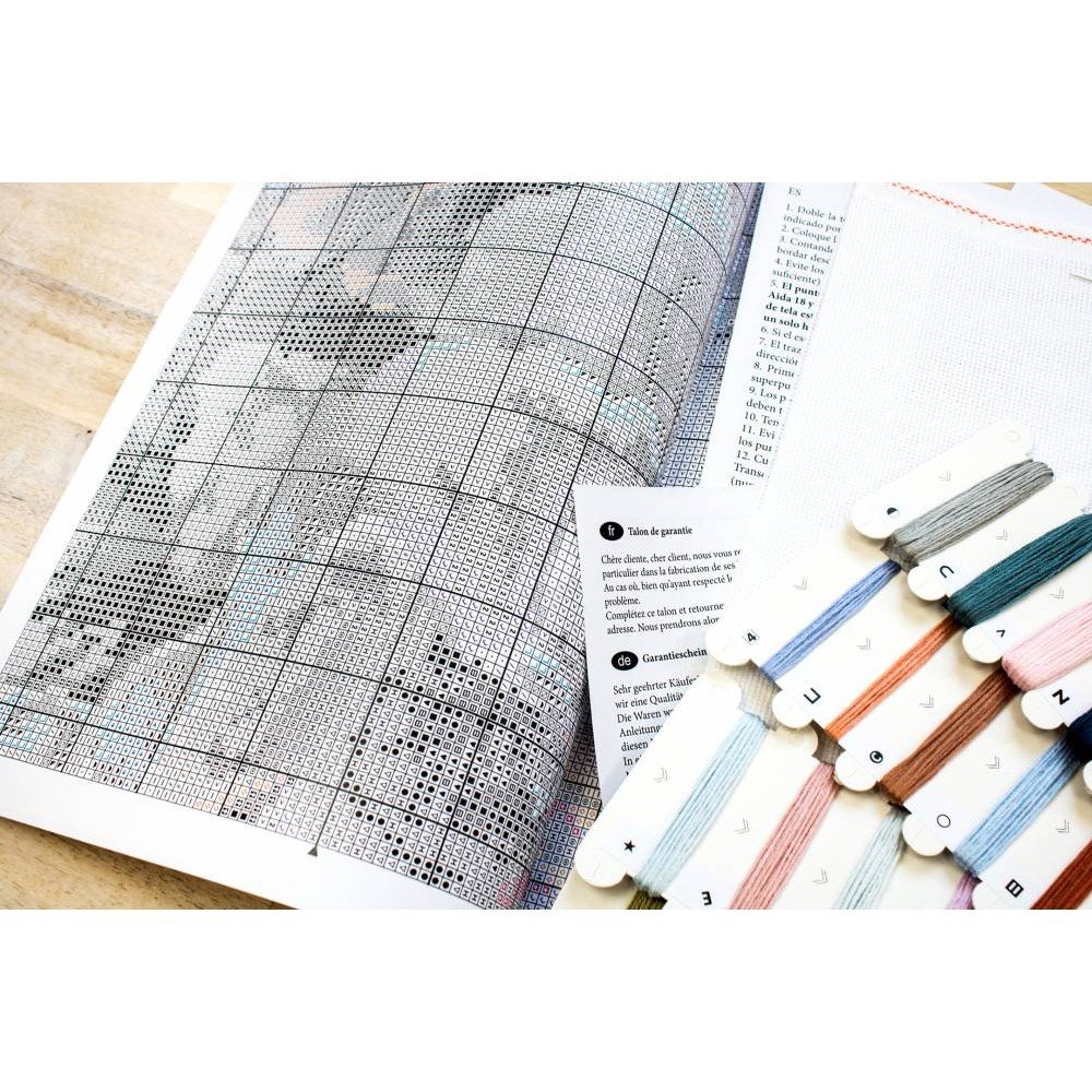 El kit incluye: tela Zweigart Aida 16ct. blanca, hilos Anchor mouline 48 colores, aguja, gráfico. Tamaño final: 29x29cm/11.42x11.42". Marco no incluido