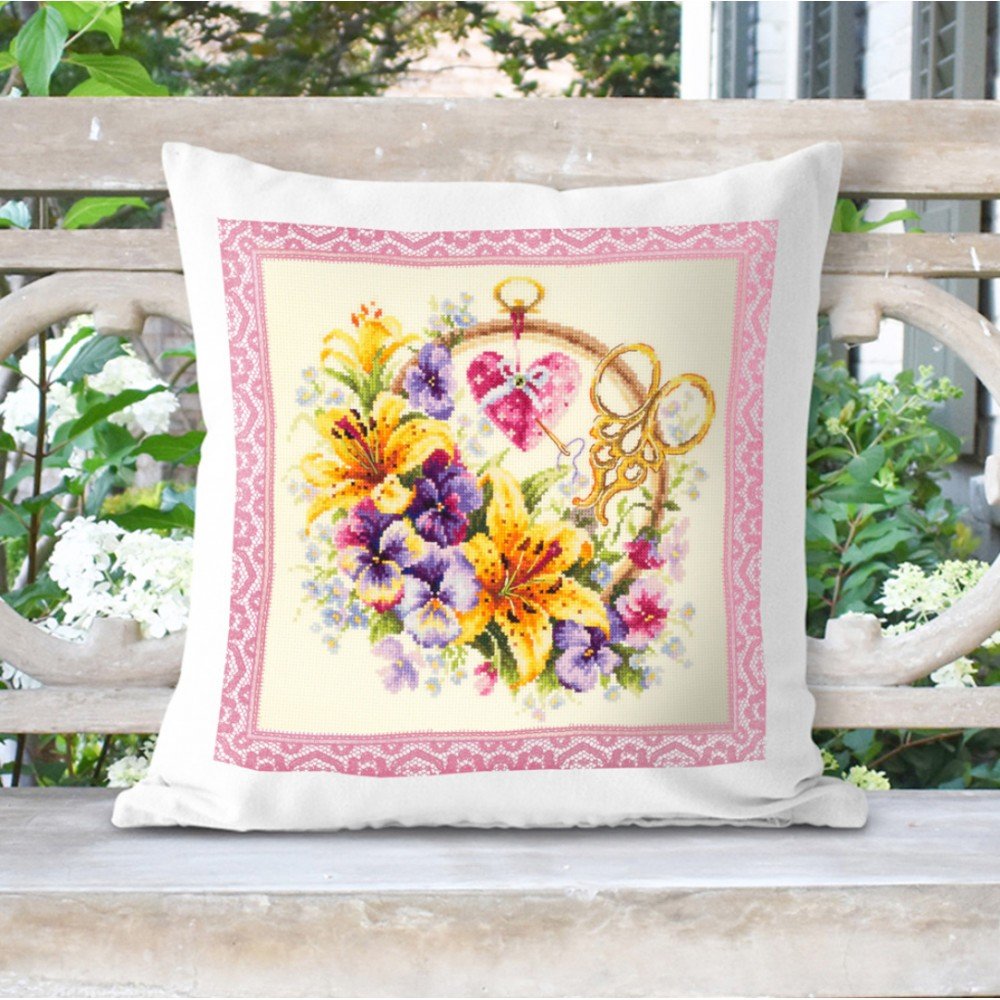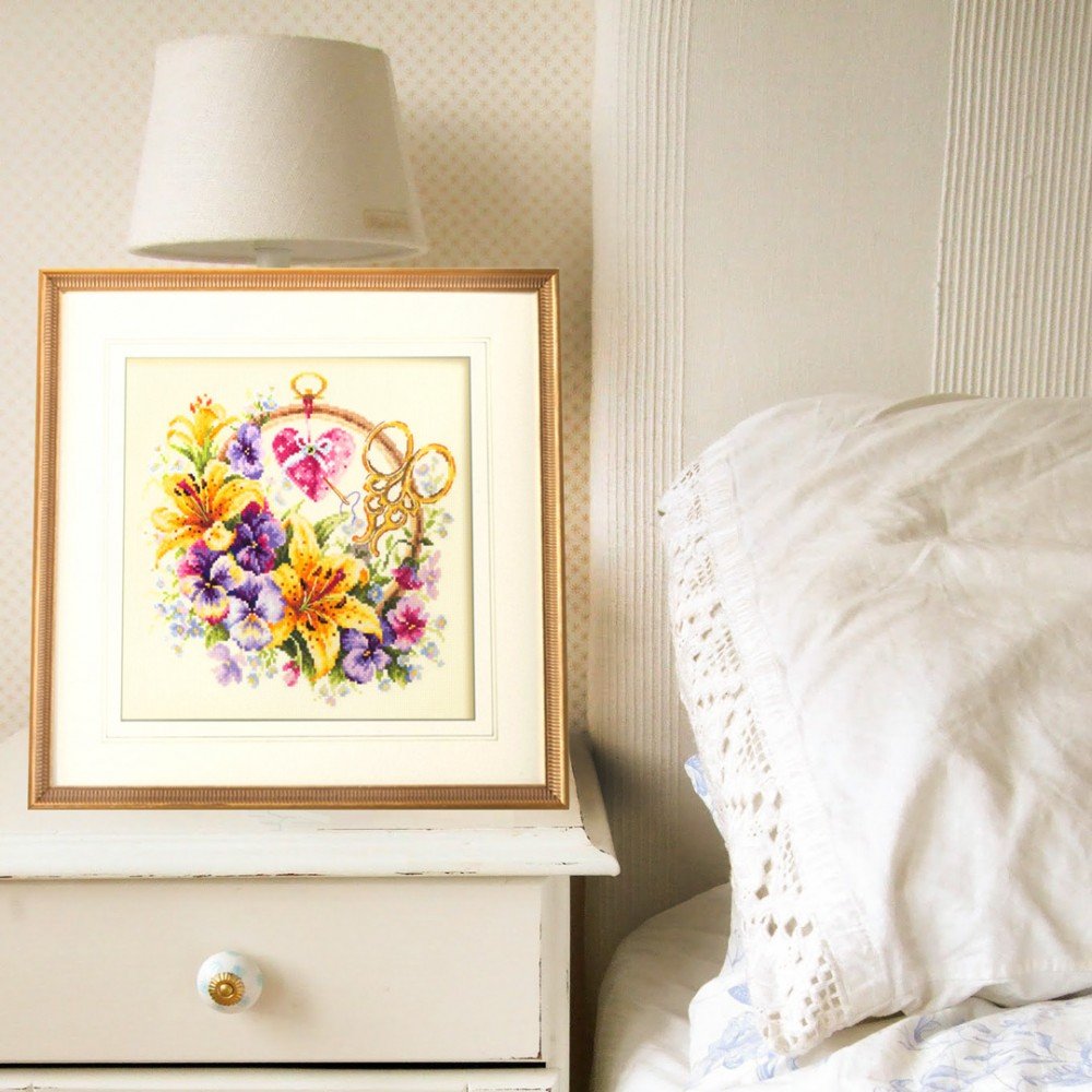 Kit contains: fabric Zweigart Aida 14ct. ivory, Gamma mouline threads 40 colours, needle, chart. Finished size: 25x25cm/9.84x9.84". Frame is not included