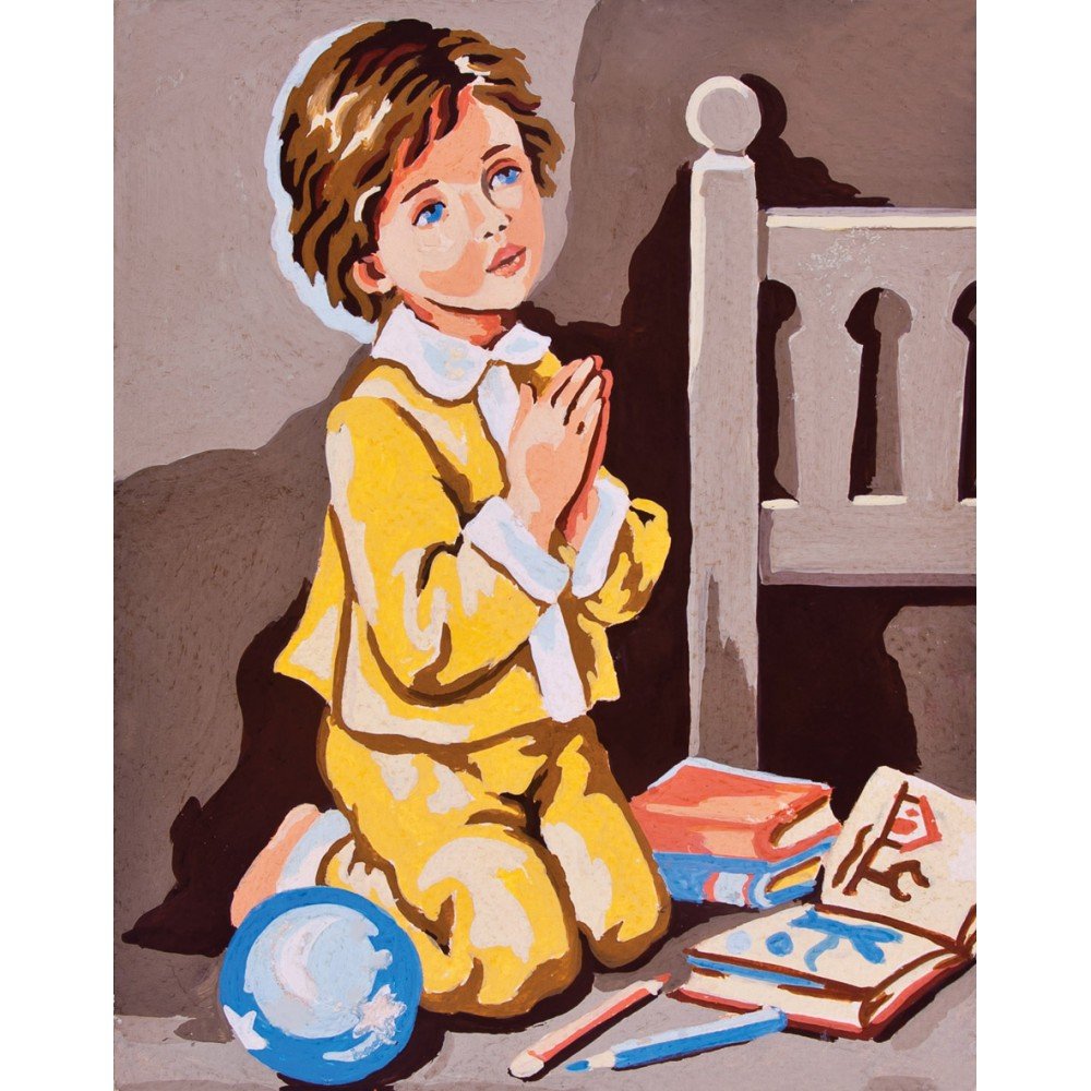 Printed tapestry canvas "Bed Time Prayers", fabric: white Zweigart Stramin (100% cotton), 44 cross stitches per 10 cm (11 count). Finished design size: 14 x 18 cm/5.51 x 7.09", canvas measurement: 20 x 25 cm/7.87 x 9.84". Threads are not included! Embroidered in cross-stitch, half-cross or tapestry. Threads suitable: wool, thick acrylic yarn, cotton mouline (e.g., DMC) - best for 4-strand cross-stitch or 6-strand half-cross. Printed color numbers from the DMC color chart for selecting any threads or beads. The canvas, resembling a rigid, finely meshed grid, allows for excellent work without hoop and chart.