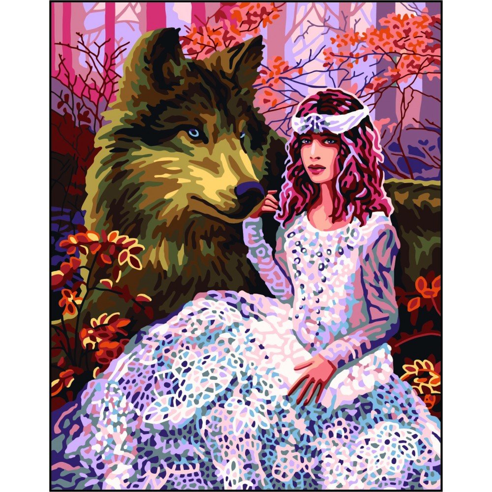 Printed tapestry canvas "Girl with a wolf", fabric: white Zweigart Stramin (100% cotton), 40 cross stitches per 10 cm (10 count). Finished design size: 50 x 40 cm/19.69 x 15.75", canvas measurement: 60 x 50 cm/23.62 x 19.69". Threads are not included! Embroidered in cross-stitch, half-cross or tapestry. Threads suitable: wool, thick acrylic yarn, cotton mouline (e.g., DMC) - best for 4-strand cross-stitch or 6-strand half-cross. Printed color numbers from the DMC color chart for selecting any threads or beads. The canvas, resembling a rigid, finely meshed grid, allows for excellent work without hoop and chart.