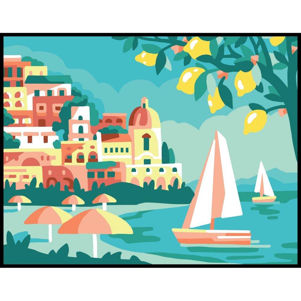 Printed tapestry canvas "Landscape with lemons", fabric: white Zweigart Stramin (100% cotton), 44 cross stitches per 10 cm (11 count). Finished design size: 18 x 14 cm/7.09 x 5.51", canvas measurement: 20 x 25 cm/7.87 x 9.84". Threads are not included! Embroidered in cross-stitch, half-cross or tapestry. Threads suitable: wool, thick acrylic yarn, cotton mouline (e.g., DMC) - best for 4-strand cross-stitch or 6-strand half-cross. Printed color numbers from the DMC color chart for selecting any threads or beads. The canvas, resembling a rigid, finely meshed grid, allows for excellent work without hoop and chart.