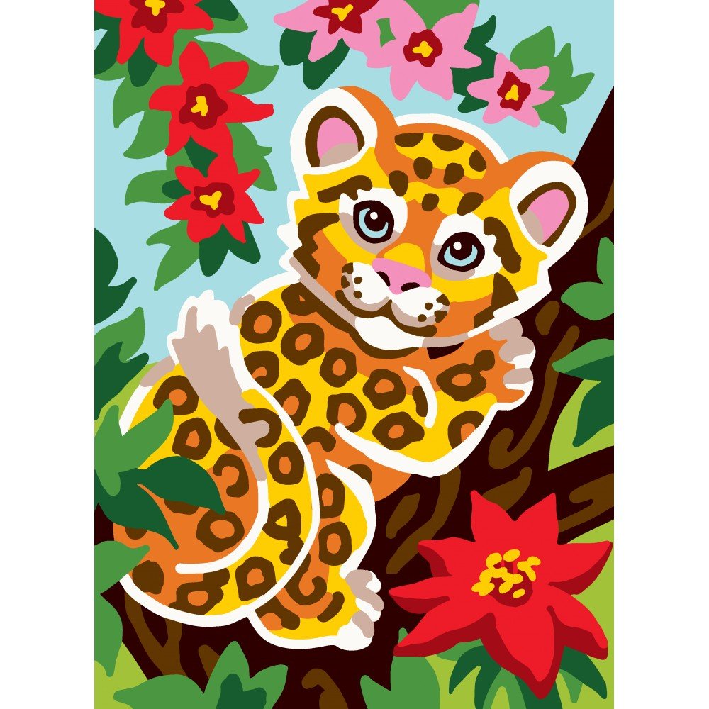 Printed tapestry canvas "Leopard", fabric: white Zweigart Stramin (100% cotton), 44 cross stitches per 10 cm (11 count). Finished design size: 22 x 30 cm/8.66 x 11.81", canvas measurement: 30 x 40 cm/11.81 x 15.75". Threads are not included! Embroidered in cross-stitch, half-cross or tapestry. Threads suitable: wool, thick acrylic yarn, cotton mouline (e.g., DMC) - best for 4-strand cross-stitch or 6-strand half-cross. Printed color numbers from the DMC color chart for selecting any threads or beads. The canvas, resembling a rigid, finely meshed grid, allows for excellent work without hoop and chart.