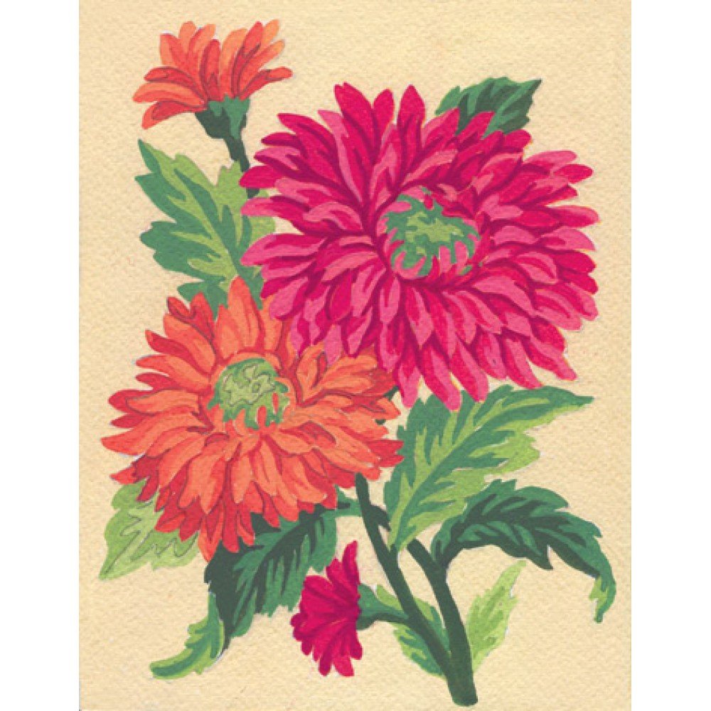 Printed tapestry canvas "Orange Daisies", fabric: white Zweigart Stramin (100% cotton), 44 cross stitches per 10 cm (11 count). Finished design size: 14 x 18 cm/5.51 x 7.09", canvas measurement: 20 x 25 cm/7.87 x 9.84". Threads are not included! Embroidered in cross-stitch, half-cross or tapestry. Threads suitable: wool, thick acrylic yarn, cotton mouline (e.g., DMC) - best for 4-strand cross-stitch or 6-strand half-cross. Printed color numbers from the DMC color chart for selecting any threads or beads. The canvas, resembling a rigid, finely meshed grid, allows for excellent work without hoop and chart.