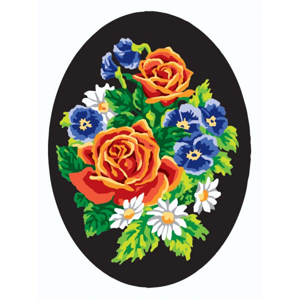 Printed tapestry canvas "Pansies and Roses, Oval", fabric: white Zweigart Stramin (100% cotton), 44 cross stitches per 10 cm (11 count). Finished design size: 18 x 24 cm/7.09 x 9.45", canvas measurement: 25 x 30 cm/9.84 x 11.81". Threads are not included! Embroidered in cross-stitch, half-cross or tapestry. Threads suitable: wool, thick acrylic yarn, cotton mouline (e.g., DMC) - best for 4-strand cross-stitch or 6-strand half-cross. Printed color numbers from the DMC color chart for selecting any threads or beads. The canvas, resembling a rigid, finely meshed grid, allows for excellent work without hoop and chart.