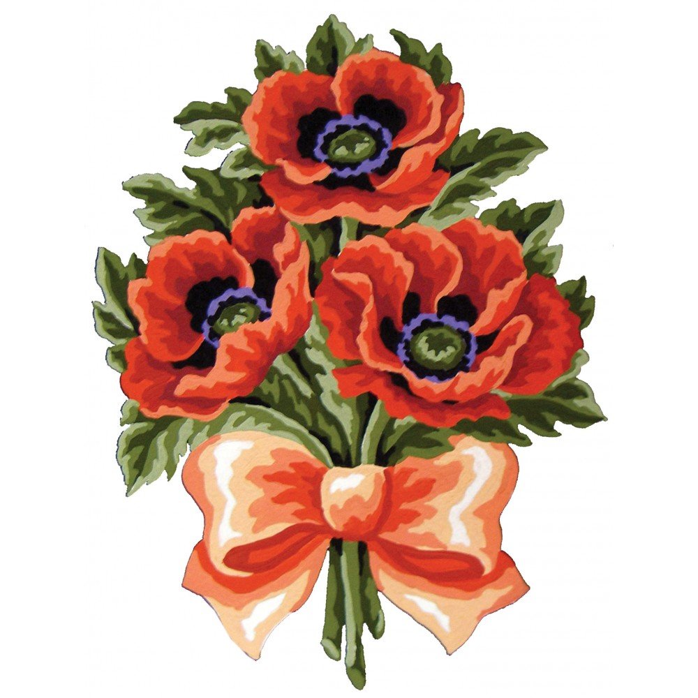 Printed tapestry canvas "Poppy Posy", fabric: white Zweigart Stramin (100% cotton), 44 cross stitches per 10 cm (11 count). Finished design size: 22 x 30 cm/8.66 x 11.81", canvas measurement: 30 x 40 cm/11.81 x 15.75". Threads are not included! Embroidered in cross-stitch, half-cross or tapestry. Threads suitable: wool, thick acrylic yarn, cotton mouline (e.g., DMC) - best for 4-strand cross-stitch or 6-strand half-cross. Printed color numbers from the DMC color chart for selecting any threads or beads. The canvas, resembling a rigid, finely meshed grid, allows for excellent work without hoop and chart.