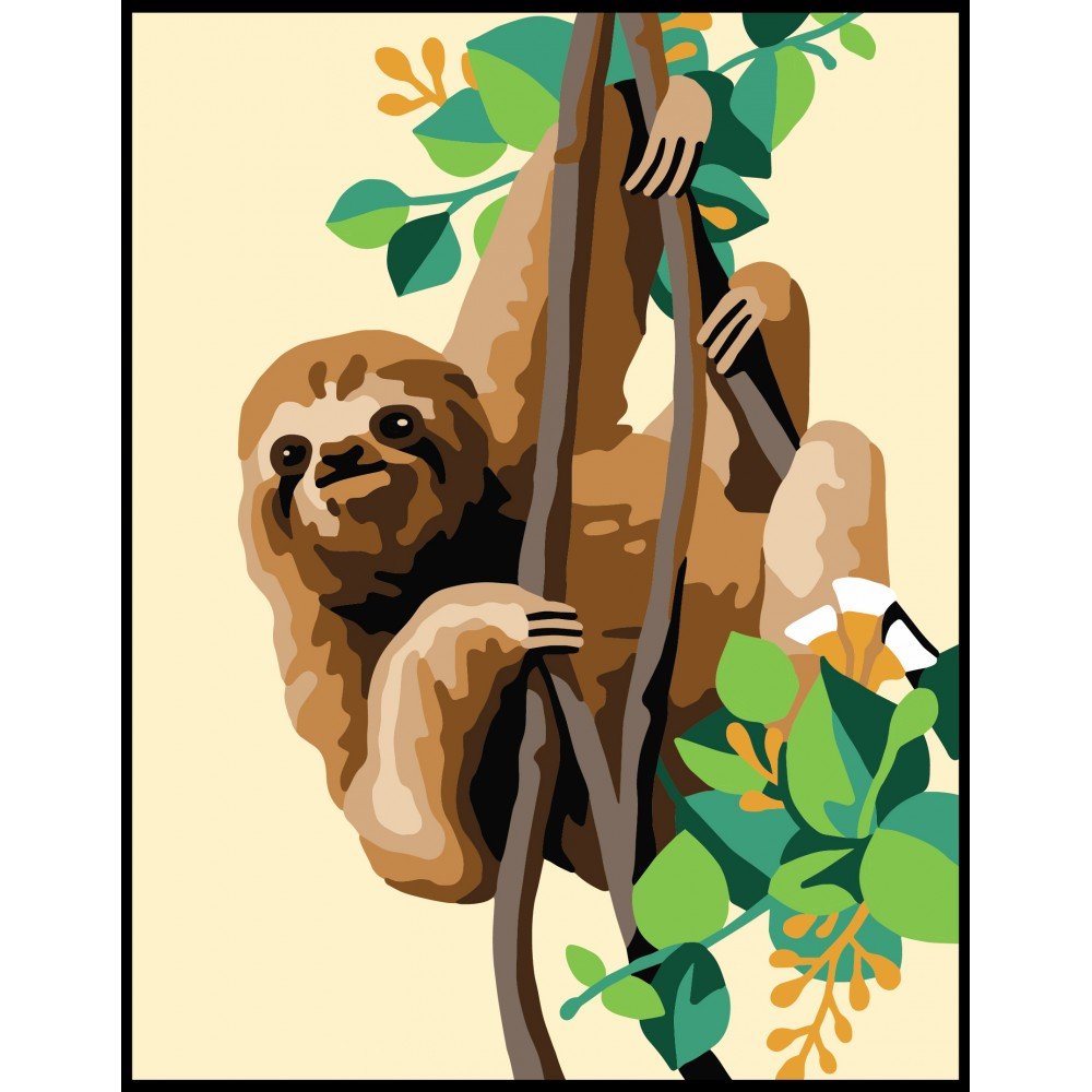 Printed tapestry canvas "Sloth", fabric: white Zweigart Stramin (100% cotton), 44 cross stitches per 10 cm (11 count). Finished design size: 14 x 18 cm/5.51 x 7.09", canvas measurement: 20 x 25 cm/7.87 x 9.84". Threads are not included! Embroidered in cross-stitch, half-cross or tapestry. Threads suitable: wool, thick acrylic yarn, cotton mouline (e.g., DMC) - best for 4-strand cross-stitch or 6-strand half-cross. Printed color numbers from the DMC color chart for selecting any threads or beads. The canvas, resembling a rigid, finely meshed grid, allows for excellent work without hoop and chart.